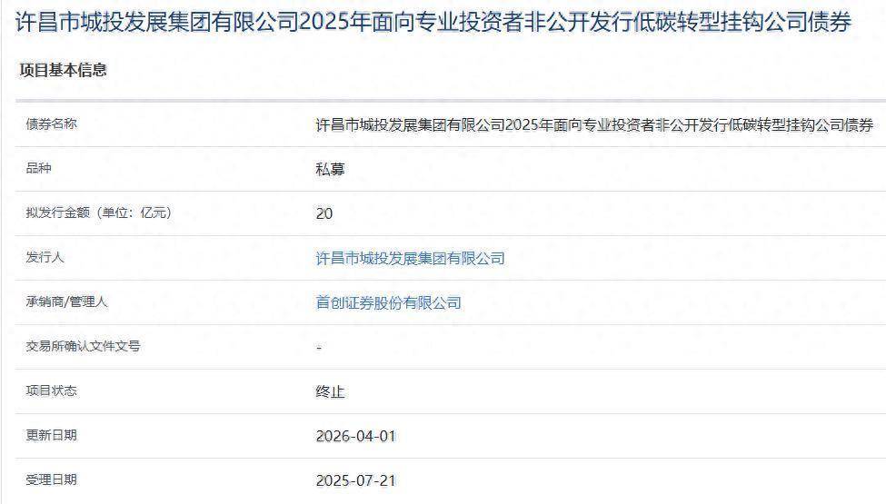 【大河财立方音讯】4月1日,上交所债券技俩信息平台露出,“许昌市城投发展集团有限公司2025年面向专科投资者非公建造行低碳转型挂钩公司债券”技俩气象更新为肃除。