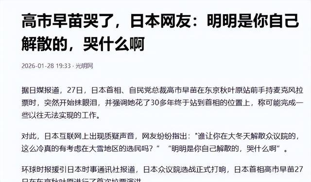 "高市哭了"奏凯冲上热搜。但日本网民的反馈,跟她遐想中只怕差了十万八沉。评述区清一色冷嘲热讽:明明是你我方罢了的众议院,哭什么?还有东说念骨干脆甩出四个字——低价眼泪。