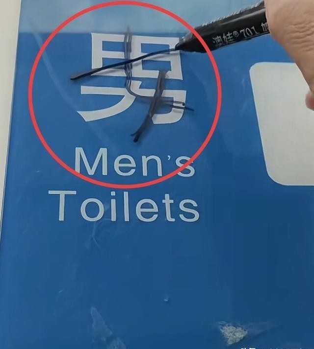 须眉将左侧的这个男厕标志改成了女厕,在写的流程中,大爷还听到了内部有两个女性言语的声息。